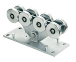 Направляющая пластина — скоба с четырьмя роликами — вариант для тяжелых створок, расситана на больший предел нагрузки и имеет более высокий показатель сопротивления раскачиванию створки, чем 2-х роликовые пластины.