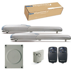 Комплект NICE HOPPBDKIT легких распашных ворот до 250 кг и шириной створки до 2,4 метров, 24 В BlueBus. Комплект: состоит из самоблокирующихся рычажных электроприводов HO7124 со встроенным блоком управления и HO7224 + приемник OXIBD, 2 пульта ДУ ON3EBD, фотоэлементы,сигнальная лампа